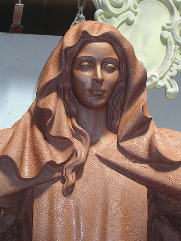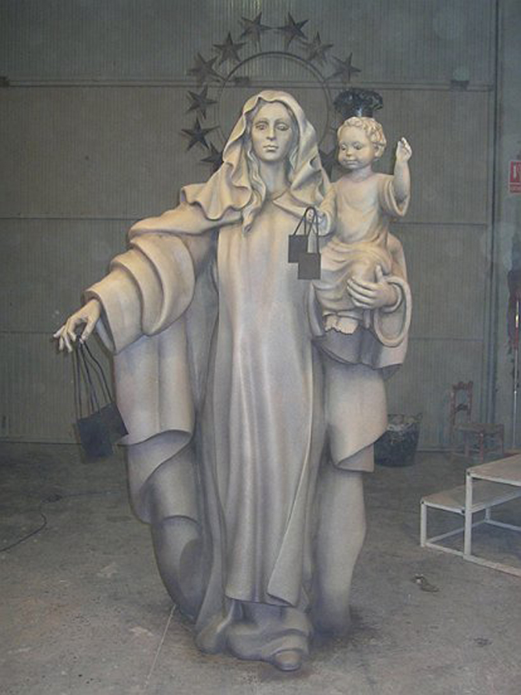 Modelado en barro, escayola a molde perdido. Reproducción en fibra de vidrio. Tratamiento con lacas para exterior